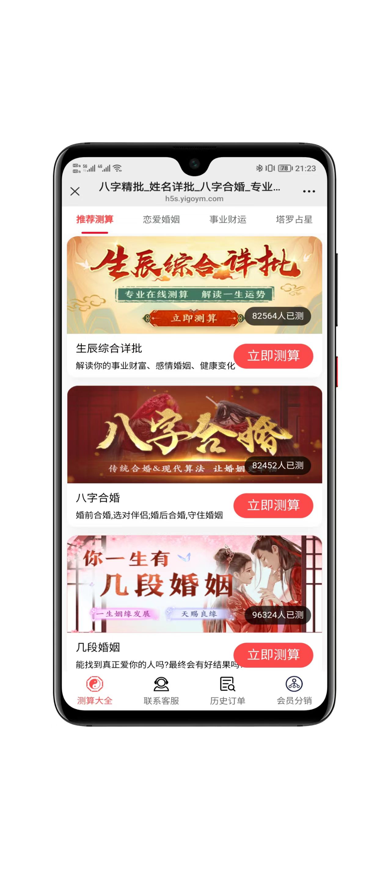 功能包括:生肖运势、八字精批、流年运势、生辰详批、八字合婚、姻缘分析、姓名配对、财运分析、号码吉凶、紫薇斗数、姓名详批、宝宝取名等,涵盖推荐测算、恋爱婚姻、事业财运、塔罗占星等模块,每种功能都可独立提取运行推广;