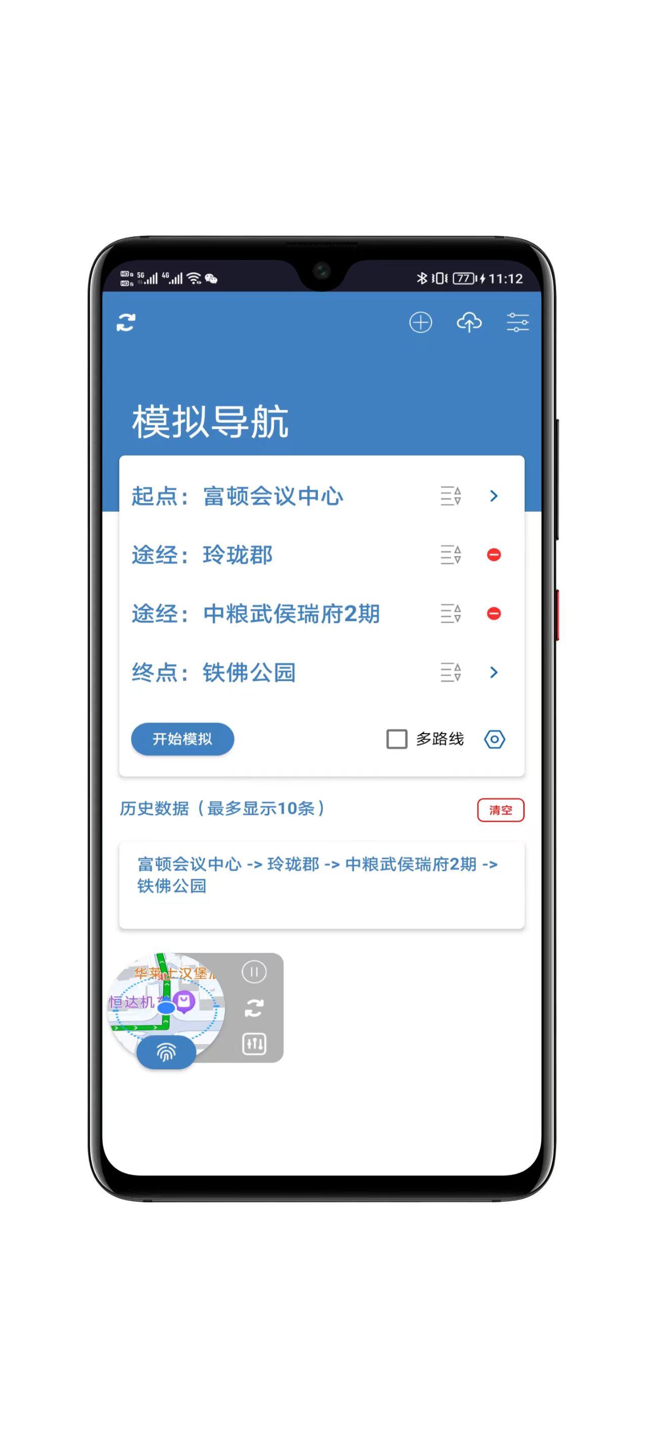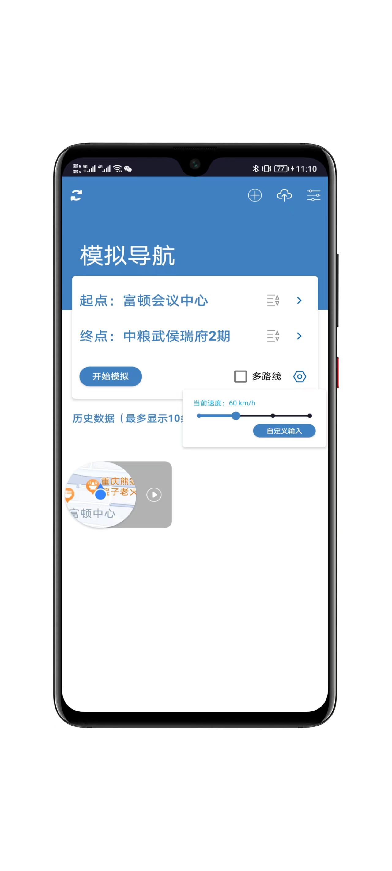 2、导航模拟:提供多路线选择、速度调节(步行/驾车/骑行模式)、悬浮窗控制等精细化导航设置;