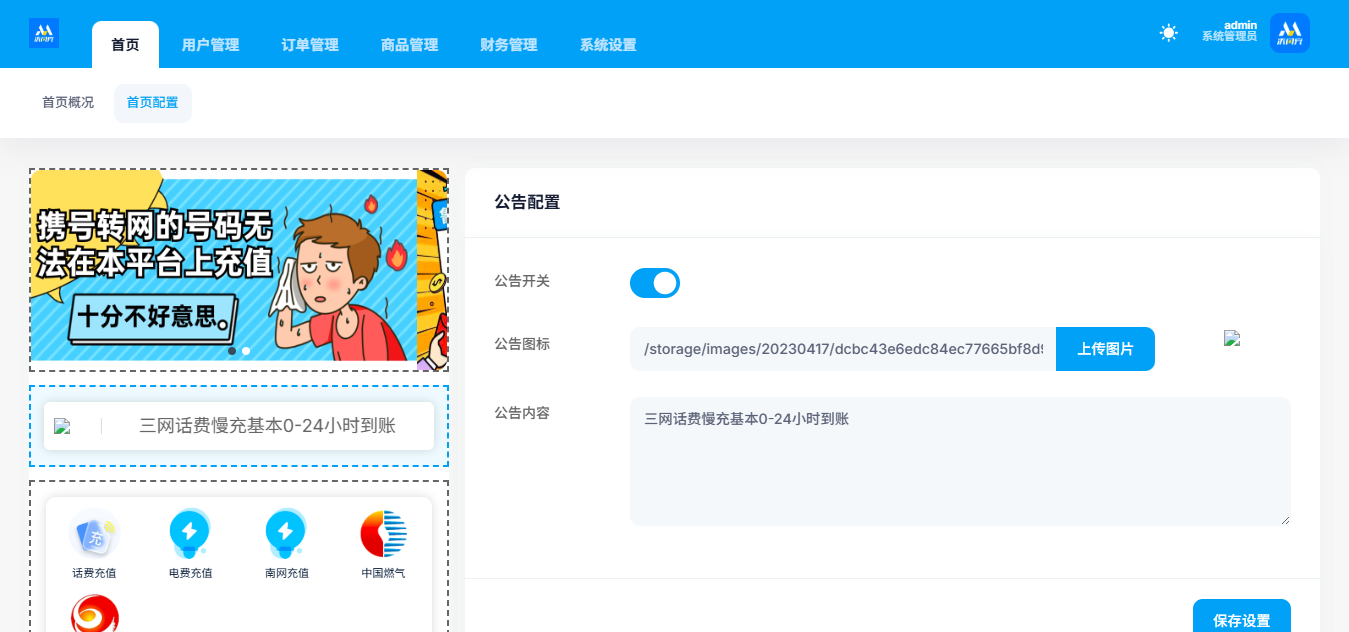 后台支持首页DIY设置,支持充值类型自定义,带广告位第三方引流跳转;