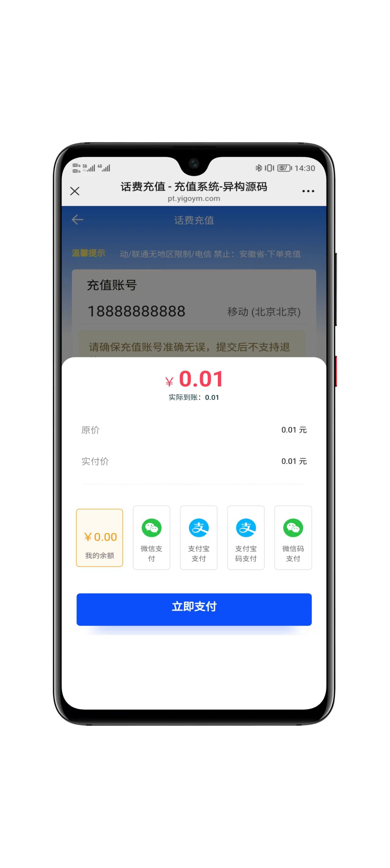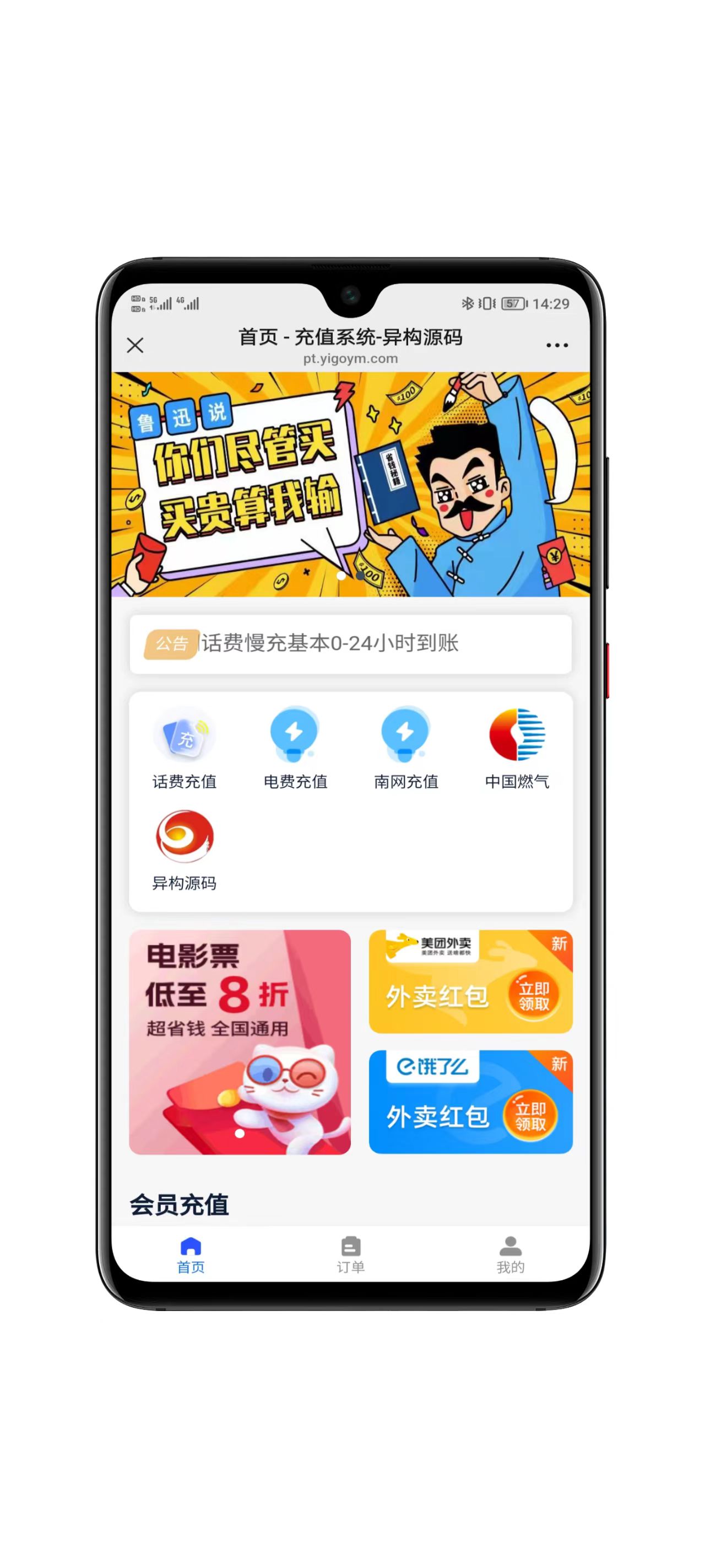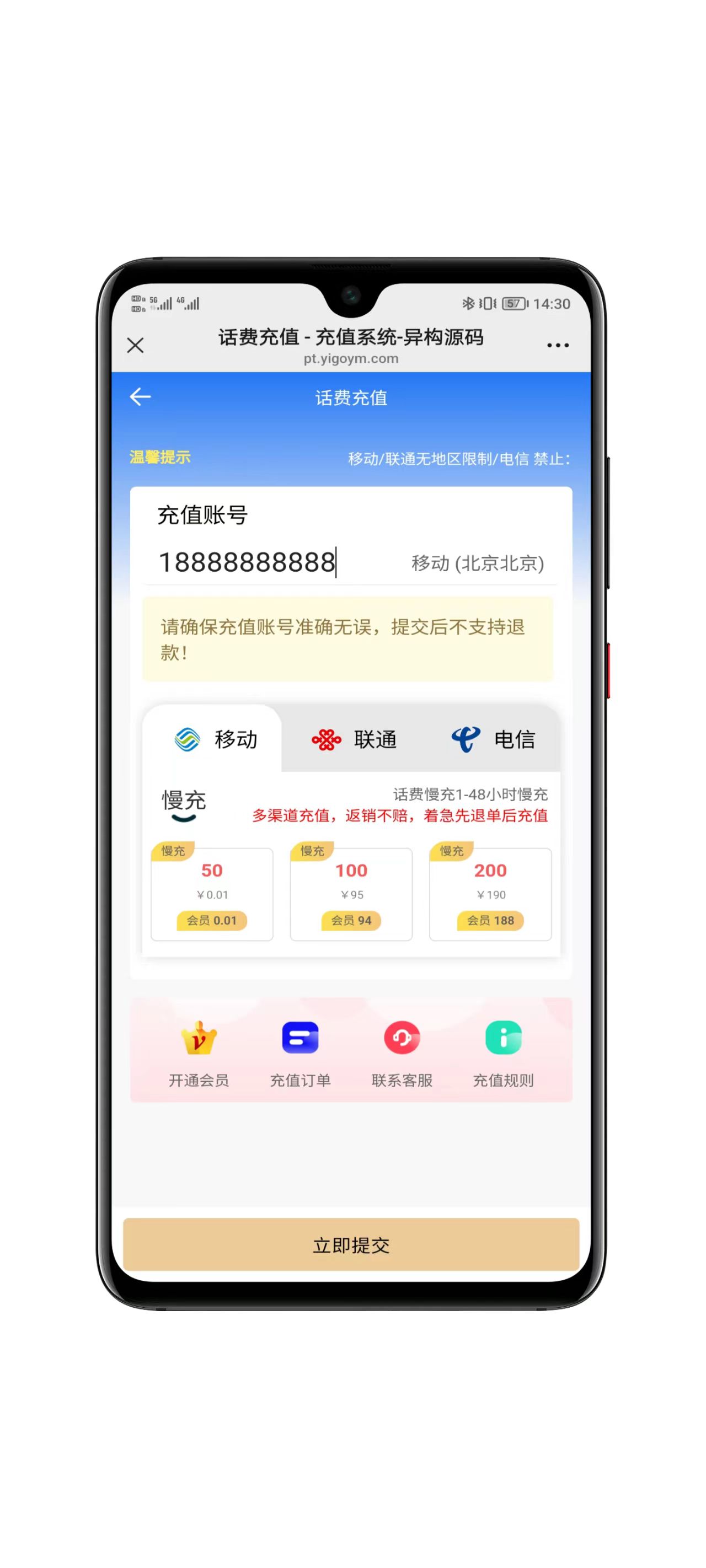最新版本的运营级充值系统,支持多网话费充值,燃气充值、各平台会员充值等,支持会员系统,兼容微信环境和手机浏览器;